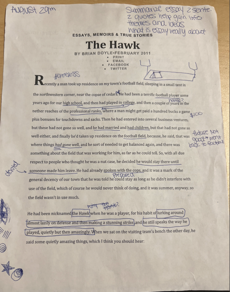 The first week of class, we were given a story named “The Hawk.” It was short, which I liked and looked interesting. When Professor Brod said “read and annotate” this was easy for me. I read it and annotated it and brought it back into class. He told us about some tips we could do to annotate this even better. When first annotating, “The Hawk”, all I did was underline things I believed to be important. I read it one time, then went back and underlined the things I remembered and thought I could use on a paper. It was sloppy and messy which made it hard to look back on when writing my paper. As shown below, you can see my annotations are just a few underlines and marking random things I thought were interesting.
